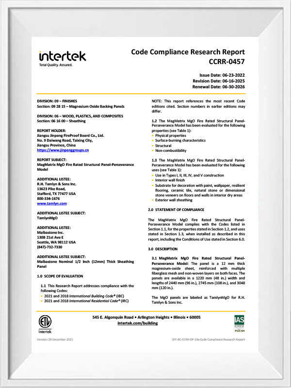 +86-523-87620182 Contact UsJiangsu Jinpeng Fireproof Board Co., Ltd. was established in 2015. It is located in the core city of China's Yangtze River Delta Economic Zone - Taixing High-tech Industrial Park, Jiangsu Province. It is a high-tech enterprise focusing on the research and development, production and application of new fireproof materials. Perseverance MgO Subfloor Sheathing Board Suppliers and Perseverance MgO Subfloor Sheathing Board Company in China.